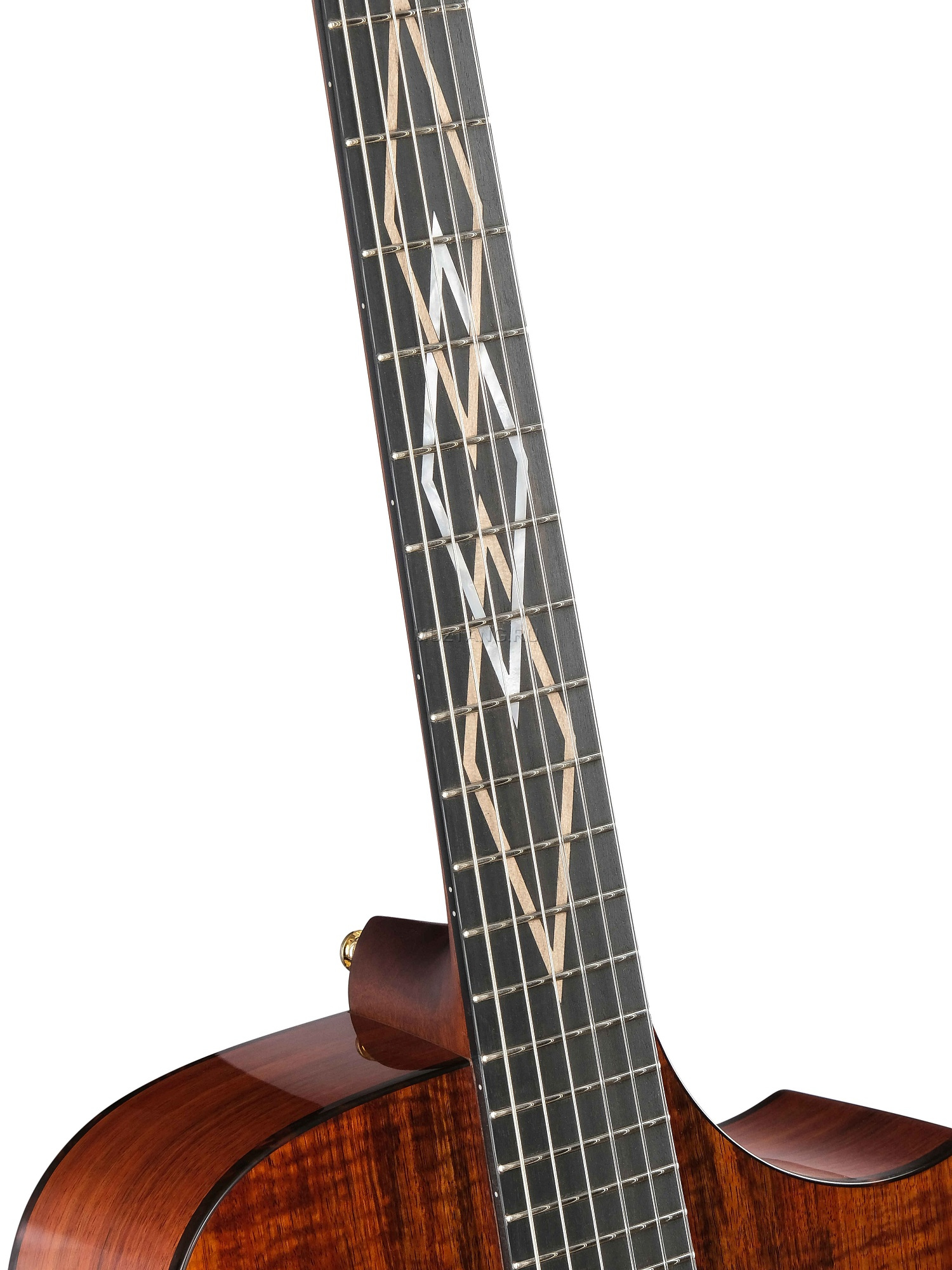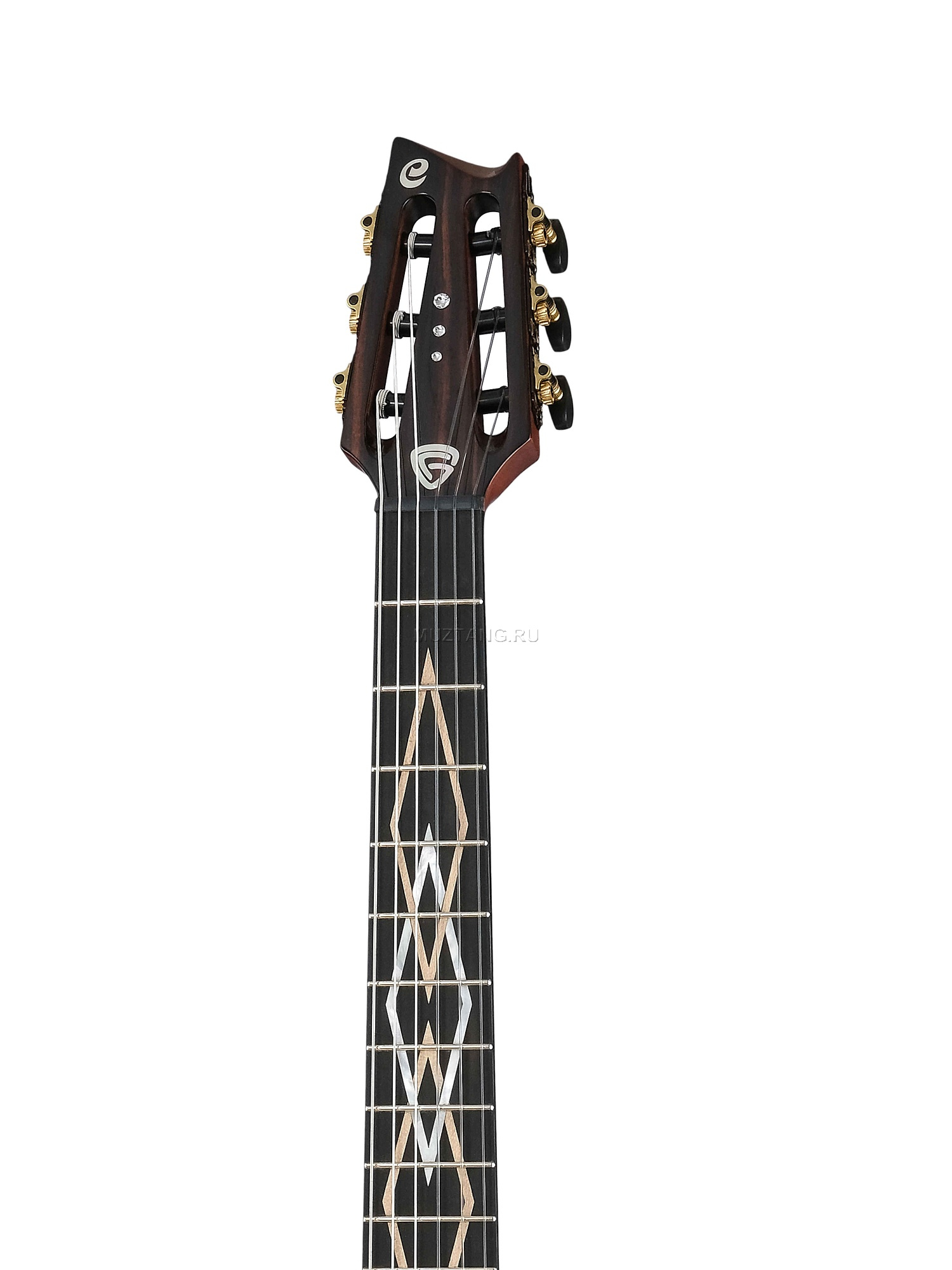 Неизменная приверженность Фрэнка Гамбале стилю ар-деко отражена в модели LUXE Nylon, ярко заметному в разработанной инкрустации накладки грифа и розетке резонаторного отверстия.